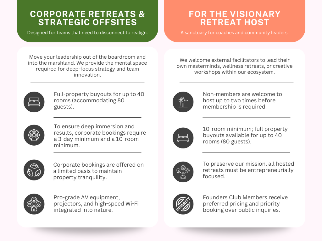 This is not just about stepping away from work, it is about reconnecting with yourself so you can return with fresh energy and vision. Blending modern comfort with coastal retreat vibes, Marsh Manor sets the tone for a new way of working, living, and leading.